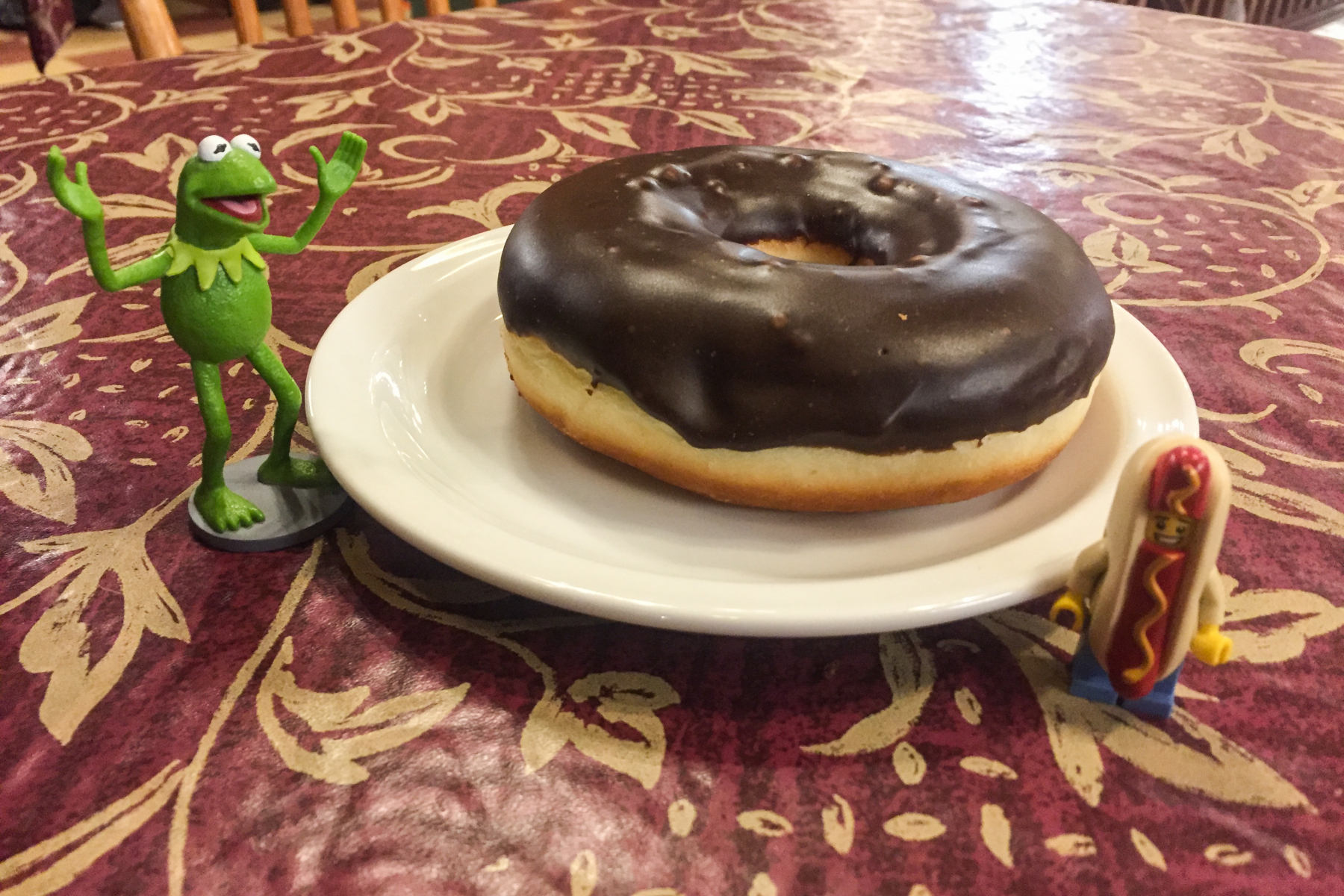 Kermit and Mr Hot Dog Lego Guy check out the World's Largest Donut
