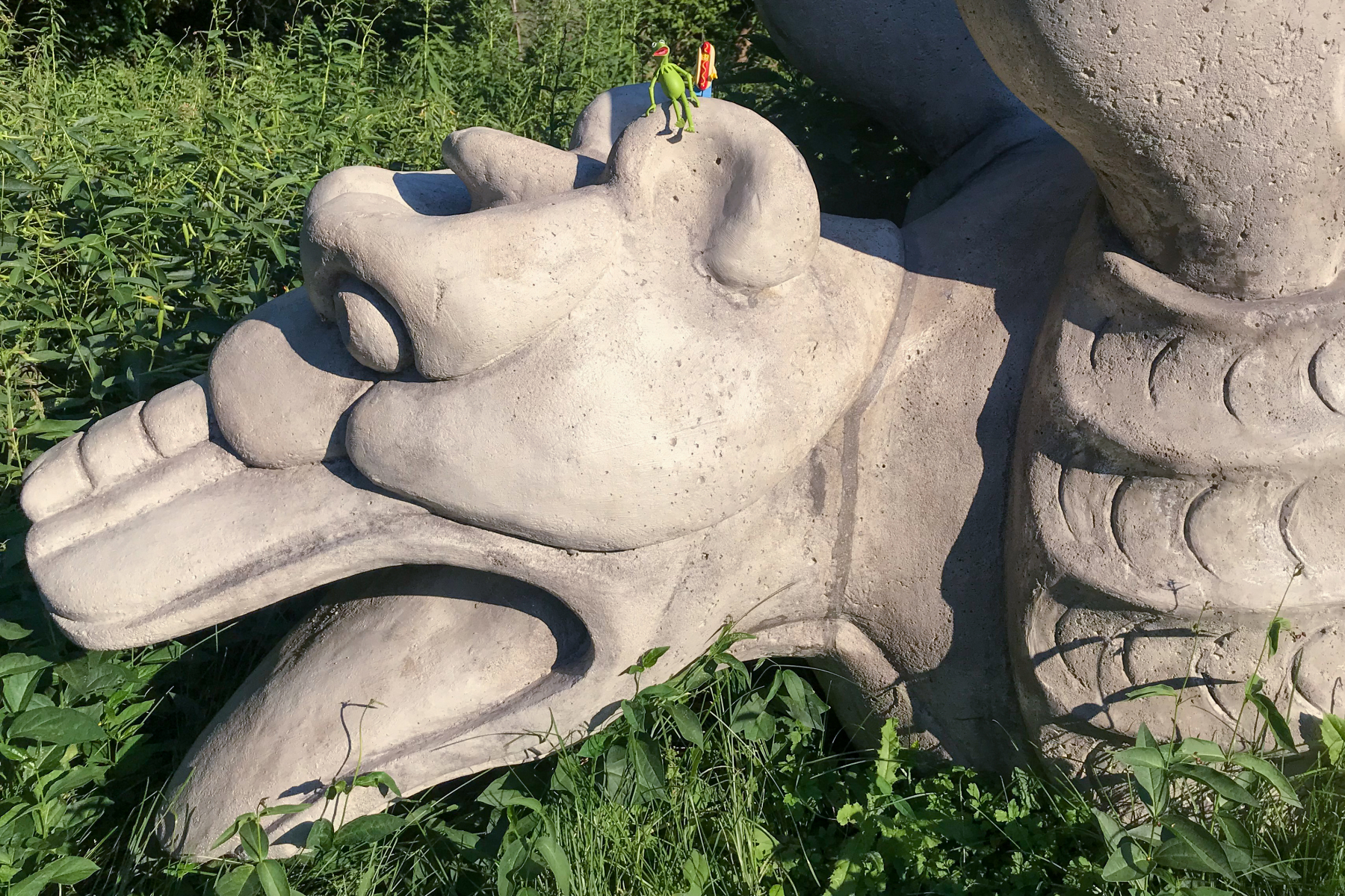Kermit and Mr Hot Dog Lego Guy Climbing a Sculpture Along The Don River